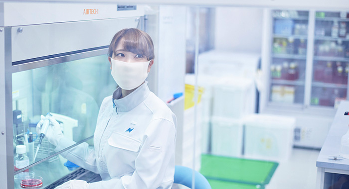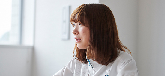 遺伝子治療の実用化のためには、治療用のDNAを細胞核内まで送達するキャリアの開発が必要だ。そこで多種の高分子を扱って研究。核移行型遺伝子デリバリーの構築に成功した。大学・大学院ではずっと高分子で、入社後手掛けているのは低分子。周りの研究員とは全然発想が違うようで、新鮮な見方をするなあ、と感心されたりする。