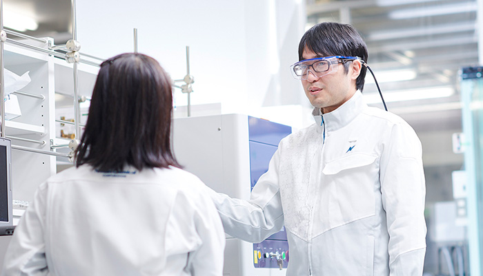 それが実現できたのは、無機コロイド材料研究部が工場内にも併設されている体制のおかげでもある。製造を担当してくれる社員と直接相談しながら、スピーディにものづくりができるのだ。