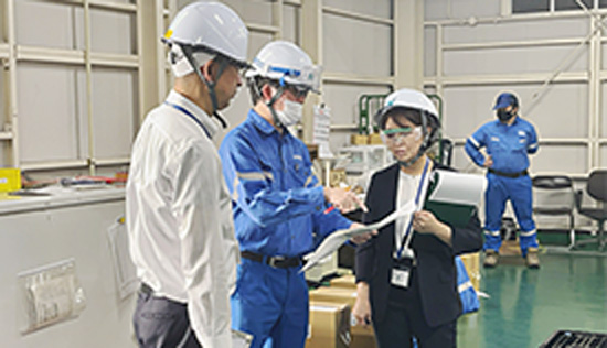 工場を監査中。現場の社員に説明を受けながら、さまざまな観点からチェックをしていく。