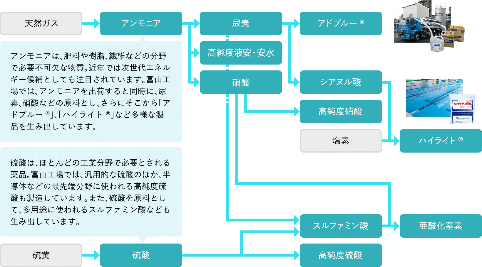 尿素は、アンモニアを原料にした製品で、農業から医薬品製造まで幅広い用途に使われ、さまざまな産業を支えています。富山工場では、50年以上の歴史を持つ尿素プラントが稼動を続け、隣接するプラントでは、高品位尿素水「アドブルー®」も生み出しています。