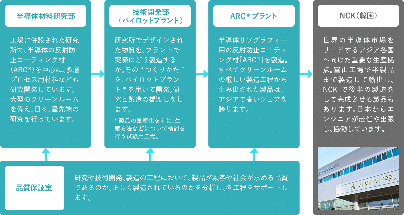 ARC®は、半導体微細加工用のコーティング材料。アジアトップシェアの製品です。半導体の微細化・高集積化が進む中、ARC®にもますます高い品質が求められています。このプラントでは、そうした要望に応え、スピーディーに高品質の製品を生み出し続けています。