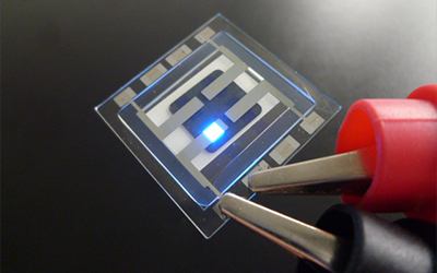 (写真は、材料科学研究所の実験室で、発光している有機EL素子)